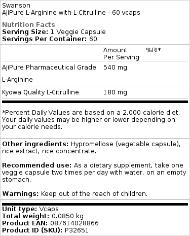 Objavte Swanson Ultra AjiPure L-Arginín s L-citrulínom, prémiový doplnok stravy navrhnutý na podporu zdravého životného štýlu. Tento produkt kombinuje farmaceutickú kvalitu L-arginínu od spoločnosti Ajinomoto a vysoko-kvalitný L-citrulín od spoločnosti Kyowa Hakko. Spolu tieto zložky prispievajú k normálnej cirkulácii a pomáhajú udržiavať kardiovaskulárne zdravie prostredníctvom ich úloh v produkcii oxidu dusnatého.