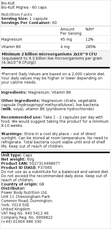 Objavte pohodu s Bio-Kult Migrea, novým prírastkom do série Bio-Kult. Tento doplnok stravy je zložený z živých baktérií a obohatený o horčík a vitamín B6, ktoré podporujú normálnu funkciu nervového systému a prispievajú k zníženiu únavy a vyčerpania. Vitamín B6 navyše podporuje normálnu funkciu imunitného systému a podporuje normálnu hormonálnu aktivitu, čo celkovo pomáha udržiavať normálnu funkciu centrálneho nervového systému.