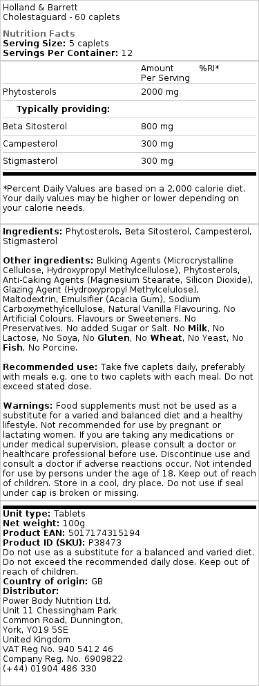 Holland & Barrett CholestaGuard kapsule obsahujú beta-sitosterol, známy svojou schopnosťou podporovať zdravú hladinu cholesterolu v normálnom rozsahu. Denná dávka najmenej 0.8 g rastlinných sterolov prispieva k tomuto prospešnému účinku. Nie je odporúčané prekročiť celkový denný príjem fytosterolov 3 g zo všetkých zdrojov. CholestaGuard tiež obsahuje lecitín a je vhodný pre vegánov a vegetariánov.