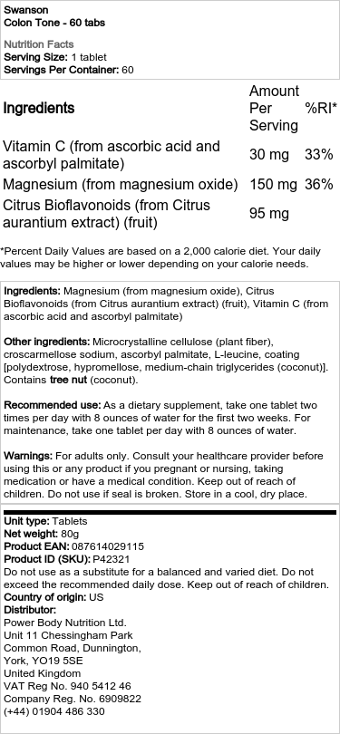 Colon Tone od Swanson Ultra je pokročilá výživová formula, ktorá prispieva k udržaniu zdravej funkcie hrubého čreva. Táto formula je špeciálne navrhnutá na: