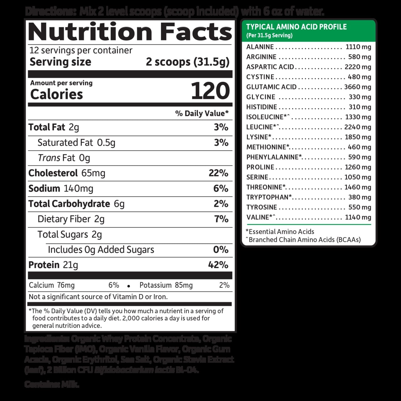 Organické koncentrát srvátkovej bielkoviny, organicka vanilkova aróma (obsahuje prirodzeny extrakt z vanilky), organicky extrakt zo stévie (sladidlo), vlákno z čiernej ríbezle, lecitin (zo slnečnice).