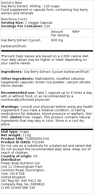 Tento produkt je bezlepkový, neobsahuje GMO a je vhodný pre vegánov a vegetariánov. Je dôležité poznamenať, že hoci extrakt z kustovnice čínskej od Doctor’s Best môže podporovať celkové zdravie a pohodu ako súčasť vyváženej stravy a zdravého životného štýlu, nemal by sa používať ako náhrada za pestrou stravu.