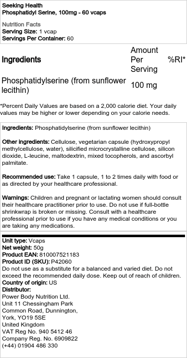 Každá kapsula obsahuje 100 mg fosfatidylserínu z ne-GMO slnečnicového lecitínu. Tento produkt je bezlepkový, bez sóje a vhodný pre vegetariánov.
