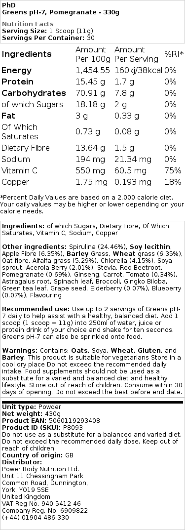 Greens pH-7 je starostlivo vybraná zmes 22 superpotravín, celých potravín a extraktov z ovocia a zeleniny. Tento produkt je vytvorený na doplnenie vašej každodennej výživy zvýšením príjmu zelených potravín, ktoré hrajú kľúčovú úlohu v zdravej strave. S takmer 3 g spiruliny na porciu spolu s ďalšími výživnými ingredienciami ponúka Greens pH-7 skvelú možnosť obohatiť vašu stravu o esenciálne zelené živiny.