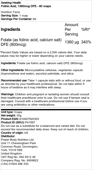 Kyselina listová od Seeking Health poskytuje 1.360 mcg DFE (800 mcg) čistého, biologicky dostupného folátu vo forme vápenaté soli kyseliny listovej na vegetariánsku kapsulu. Táto forma folátu (vitamín B9) sa efektívne premieňa na L-metylfolát, dominantnú formu folátu v krvi. Tento produkt je ideálny pre tých, ktorí hľadajú alternatívu k metylovaným živinám, keďže podporuje dôležité telesné funkcie ako delenie buniek a tvorbu nových červených krviniek šetrným spôsobom.