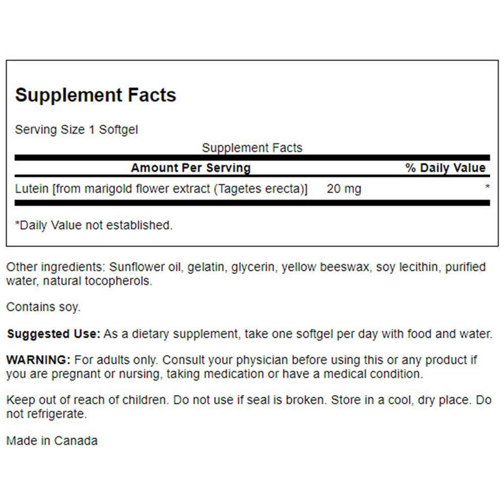 Podporuje zdravú funkciu očí a prispieva k udržaniu zdravia očí, vyrobené z kvetov nechtíka. Pomáha znížiť únavu očí. Naše vysoko účinné mäkké kapsuly Swanson Ultra Lutein obsahujú 20 mg čistého, kryštalického luteinu. Lutein je dôležitý karotenoid v makule oka a prispieva k ochrane pred oxidačným poškodením spôsobeným ultrafialovými lúčmi slnka. Zlepšite svoju antioxidačnú ochranu s naším najefektívnejším doplnkom luteinu! Tento produkt predstavuje prvotriedny zdroj luteinu pre každodennú údržbu vášho zdravia očí.