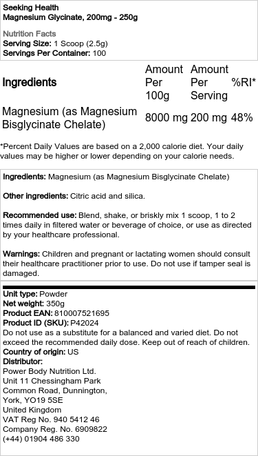 Magnéziumglycinát vo forme prášku od Seeking Health je vysoko biologicky dostupná forma magnézia, dodávaná vo flexibilnom práškovom formáte. Tento ľahko rozpustný prášok možno ľahko dávkovať podľa individuálnych potrieb a zmiešať s vodou, džúsom alebo vaším obľúbeným jedlom či nápojom. Magnézium je esenciálny minerál, ktorý sa prirodzene nachádza v tele a hrá úlohu ako kofaktor pri mnohých enzýmových procesoch. Prispieva k regulácii biochemických reakcií ako syntéza bielkovín, funkcia svalov a nervov, ako aj udržiavanie normálneho krvného tlaku. Magnézium tiež podporuje zdravú relaxáciu svalov tým, že neutralizuje účinky vápnika na hladké svaly. Je nevyhnutné pre produkciu energie a rozvoj a udržiavanie zdravých kostí.