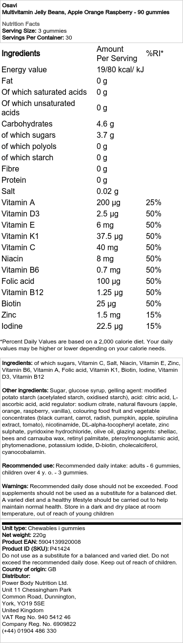 Objavte farebný a chutný spôsob, ako podporiť svoje každodenné zdravie s Osavi Multivitamínovými želé fazuľkami. Tieto ovocné gumené cukríky s príchuťami jablka, pomaranča a maliny sú obohatené o starostlivo vybranú zmes vitamínov a minerálov, ktoré pomáhajú podporovať zdravý životný štýl. Naše želé fazuľky sú formulované tak, aby doplnili, nie nahradili rozmanitú stravu.