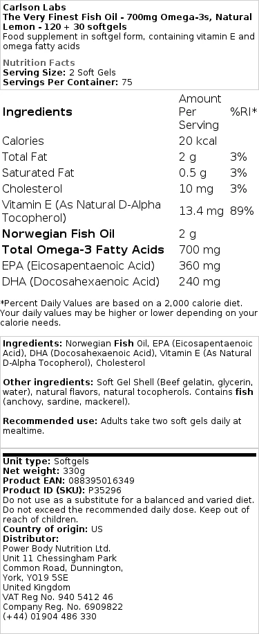 Kapsuly The Very Finest Fish Oil s prírodnou citrónovou príchuťou obsahujú esenciálne omega-3 mastné kyseliny EPA a DHA, ktoré prispievajú k udržaniu zdravej funkcie mozgu, srdca, zraku a kĺbov. Pre maximálnu čerstvosť sa The Very Finest Fish Oil extrahuje z hlbokomorských rýb pomocou tradičných udržateľných metód. Každá fáza výroby je starostlivo spracovaná za účelom zaistenia najvyššej kvality od mora po obchod.