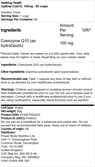 Zloženie: Koenzým Q10 (ako hydroQsorb) Ďalšie zložky: Gama-cyklodextrín a hypromelóza. Odporúčané použitie: Užívajte 1 kapsulu kedykoľvek počas dňa s jedlom alebo bez jedla alebo podľa pokynov lekára. Upozornenie: Deti a tehotné alebo dojčiace ženy by sa mali pred použitím poradiť so svojím ošetrujúcim lekárom. Nepoužívajte, ak je poškodená ochranná plomba. Ak užívate lieky, najmä lieky na riedenie krvi, ako je warfarín, pred použitím sa poraďte so zdravotníckym pracovníkom.