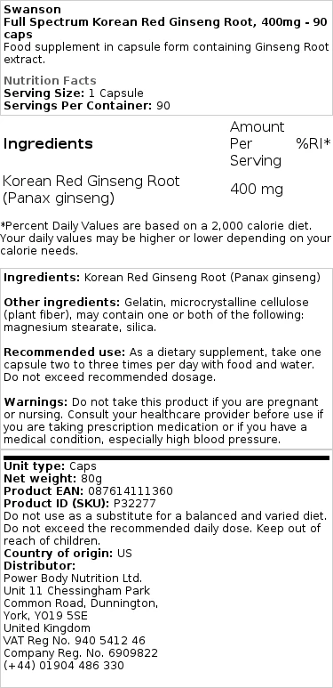 Swanson – Plný spekter kórejského červeného ženšenu, 400 mg – 90 kapsúl