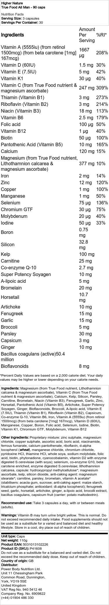 V hektickom každodennom živote môže byť ťažké vždy jesť vyvážené jedlá, preto sme vyvinuli True Food All Man. Tento pokročilý vzorec je určený pre mužov všetkých vekových skupín na rýchle vstrebávanie živín, ktoré podporujú funkciu imunitného systému aj trávenie a celkovú pohodu. S ingredienciami ako CoQ10, betaglukány, jód a esenciálne stopové prvky poskytuje nevyhnutné živiny spôsobom blízkym prírodnej metóde. Je to náš doteraz najkomplexnejší doplnok stravy pre mužské zdravie.