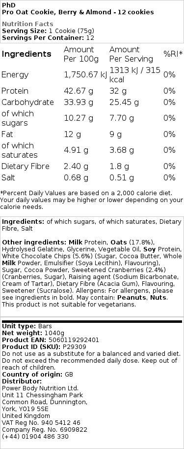 Vychutnajte si jemnú chuť a výživové výhody ovsených sušienok Pro od PhD Nutrition, teraz dostupné vo vábivej variante s bobuľami a mandľami. Táto pečená sušienka nie je len potešením pre vaše chuťové poháriky, ale aj praktickou podporou pre vaše celkové zdravie a fitness ciele.