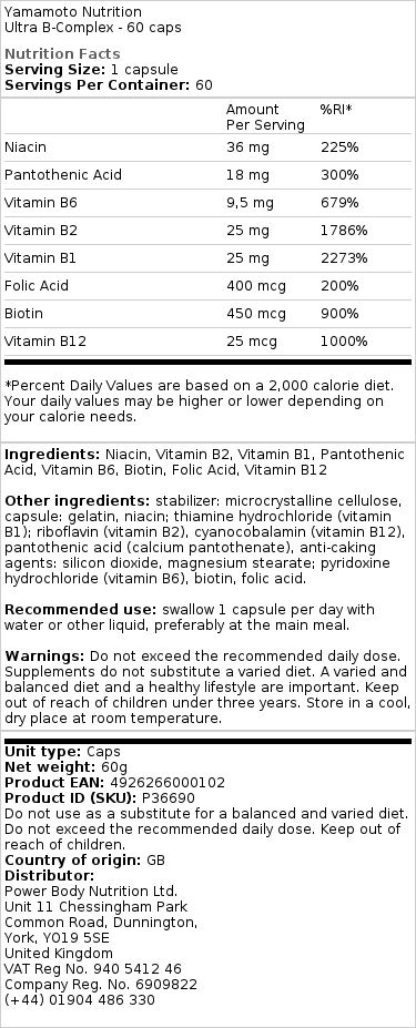 Každá fľaša Ultra B-Complex obsahuje 60 ľahko prehltnuteľných kapsúl, čo postačuje na dvojmesačné pravidelné používanie. Vyrobené podľa prísnych štandardov čistoty a potencie máte istotu vysokej-kvality doplnku od Yamamoto Nutrition.