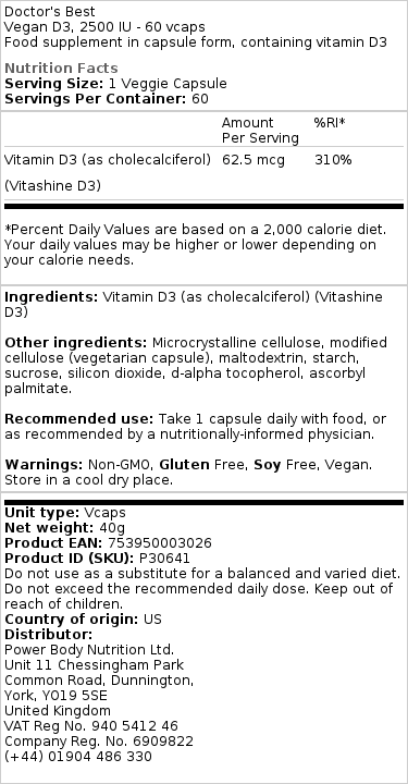 Náš vegánsky vitamín D3 je ideálny pre tých, ktorí hľadajú rastlinnú alternatívu tradičným doplnkom stravy. Je obzvlášť užitočný v obdobiach obmedzeného slnečného svitu alebo pre osoby, ktorých životný štýl neumožňuje veľa času strávenom vonku. Doctor’s Best Vegan D3 používa formulu bez gluténovej a GMO suroviny a je certifikovaný ako vegán aj vegetarián.