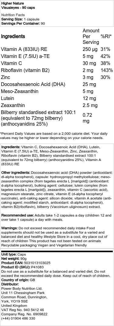 VisualEyes je váš partner v túžbe živiť a chrániť vaše oči zvnútra. S mocnou zmesou živín vrátane vyššej koncentrácie luteinu zo sústredeného zdroja a meso-zeaxantínu a vegánskeho DHA táto receptúra podporuje jasný zrak*. Meso-zeaxantín je obzvlášť cenný a často odporúčaný optikmi spolu s luteinom a zeaxantínom pre optimálnu starostlivosť o oči. *Priaznivý účinok sa dosiahne pri dennom príjme 250 mg DHA.