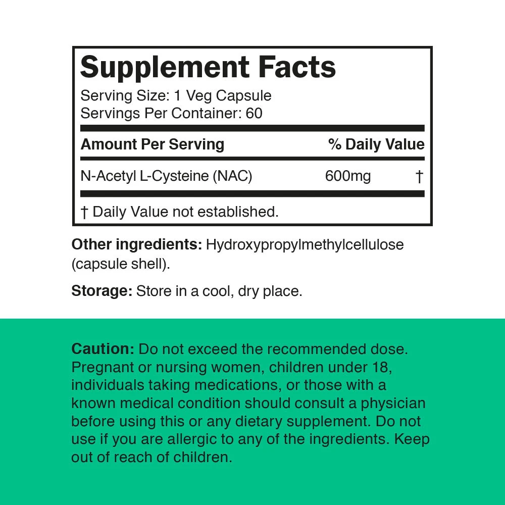 - Hlavné zložky: Každá vegánska kapsula obsahuje 600 mg N-Acetyl L-Cysteine.