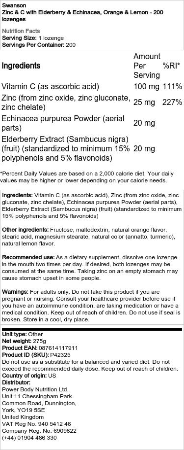 Posilnite svoje zdravie s pastilkami Swanson Zinok & C! Táto zmes vitamínov, minerálov a bylín je spojencom pre vašu imunitu, obsahujúca zinok, vitamín C, šípky a echinaceu. Tieto zložky spolupracujú v harmónii na podporu zdravého imunitného systému.